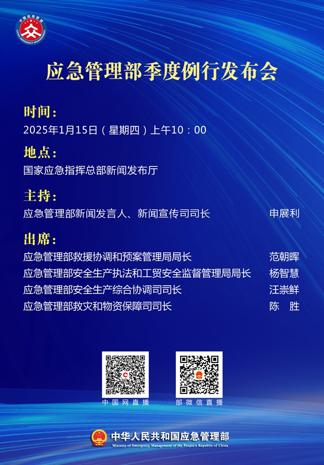 应急管理部定于1月15日(星期四)上午10时在国家应急指挥总部新闻发布厅举行季度例行新闻发布会,通报2025年全国安全生产、自然灾害情况和岁末年初安全防范工作部署,介绍安全生产、救灾救助和应急救援有关工作进展,并答记者问。应急管理部新闻发言人、新闻宣传司司长申展利主持,救援协调和预案管理局局长范朝晖、安全生产执法和工贸安全监督管理局局长杨智慧、安全生产综合协调司司长汪崇鲜、救灾和物资保障司司长陈胜出席。
